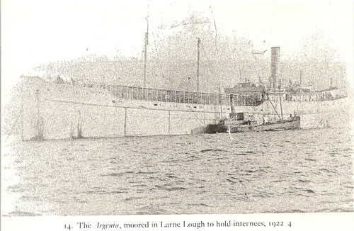 HMS Argenta was built under contract in July 1917 by National Shipbuilding Company in Orange, Texas, originally as a Wooden Steamer Cargo Ship. Launched May 1919 and used in US until late 1921. As early as Nov 1919 it had signs of leaks and was declared unseaworthy in May 1922, then being sold as a prison ship. Following the 1922 uprising it was used as a British Military Base and Prison Ship for holding Irish Republicans. By February 1923 the British were detaining 263 men on the Argenta, moored of the coast of Larne.
