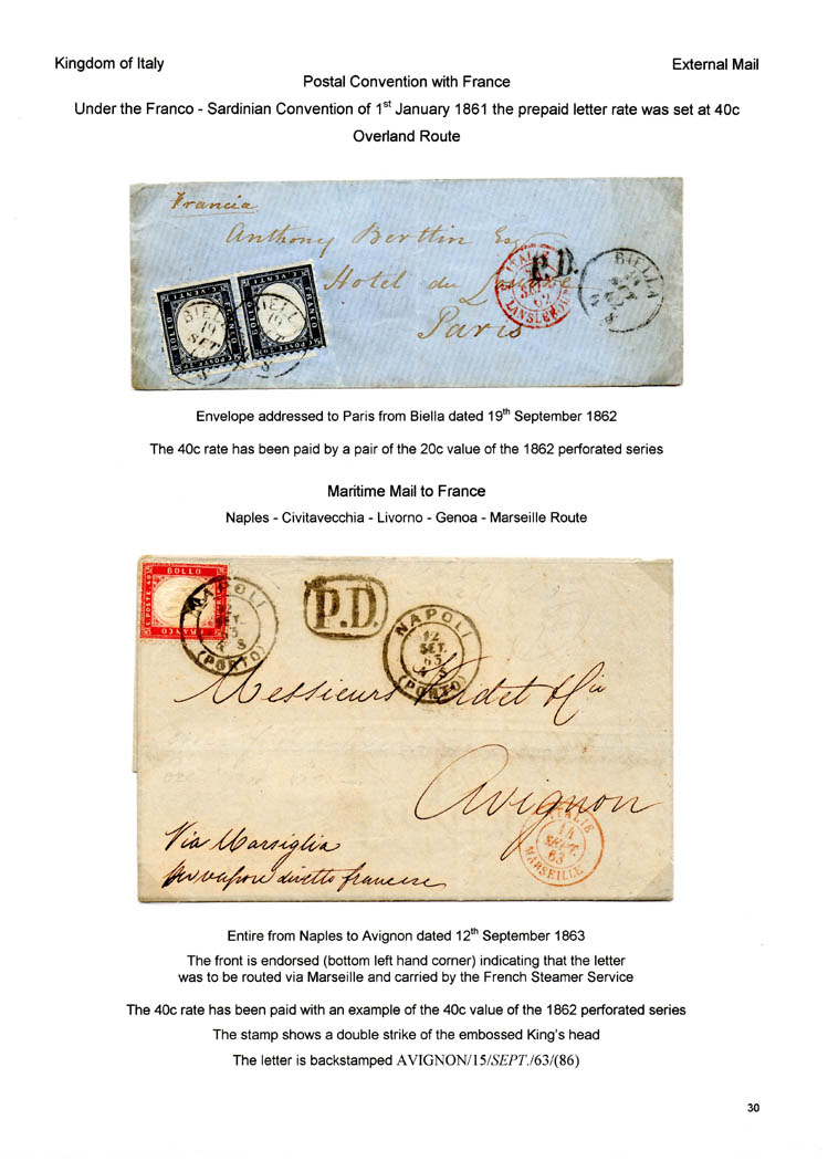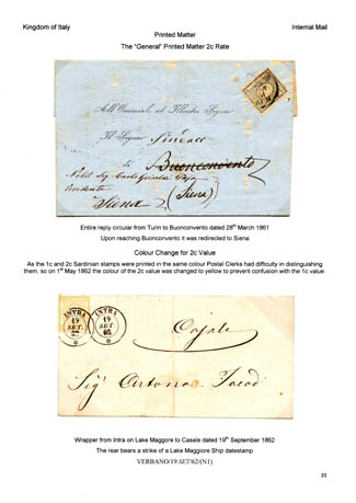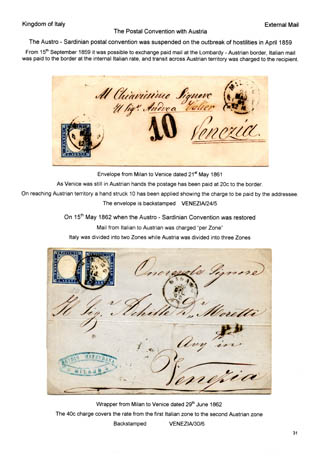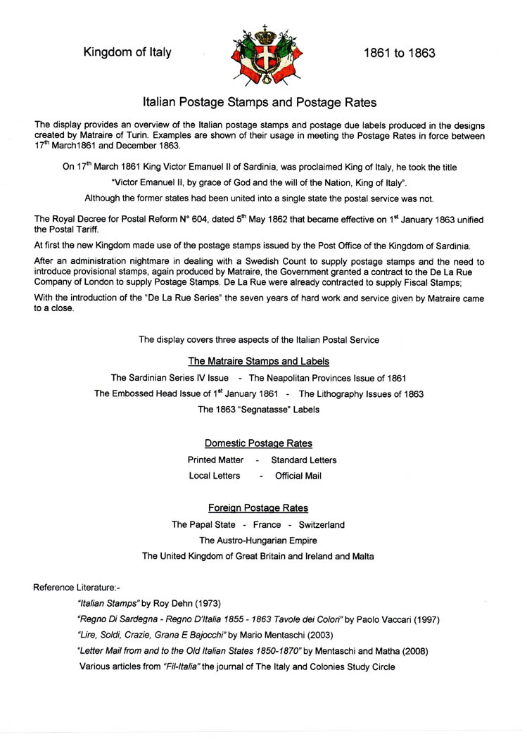 Italian Postage Stamps and Postage Rates, 1861-63 by David Sweeney. The display provides an overview of the Italian postage stamps and postage due labels produced in the designs created by Matraire of Turin. The display was presented to the North of Ireland Philatelic Society in 2010.To see a larger image, click on the relevant page and a larger image will open on a new page. Some browsers allow this to be enlarged further by clicking on the page. Once viewed, click the back arrow on your browser to return to this page.