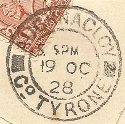 Aughnacloy / Co. Tyrone Earliest known date - 7 Oct 1920 Codes Known - 12PM SR 34mm |
