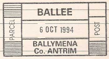 Ballee, Ballymena Co Antrim / Parcel / Post. Earliest known date - 6 Oct 1994 Codes Known - R 63x33mm |